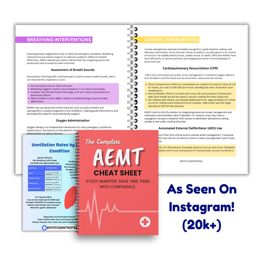 No fluff. Just the most essential AEMT content — airway management, meds, interventions, assessments, and more — distilled into one visual, easy-to-review cheat sheet.